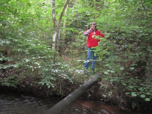 Kåre ville liiiige gå over på den anden side – men stammen var MEGET glat og Kåre blev våd. 🙂