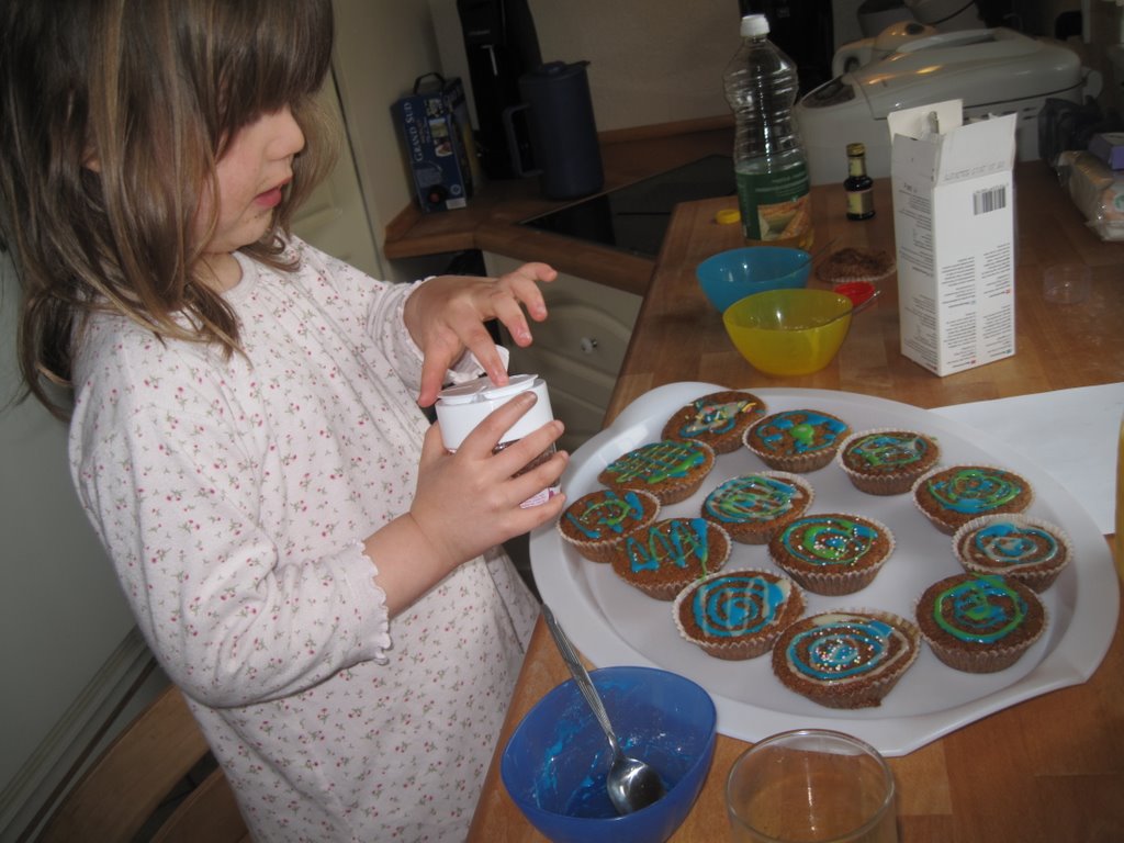 Så er det blevet morgen og kagerne er kolde – blå, grøn og gul glasur og fire forskellige slags krymmel. 🙂
