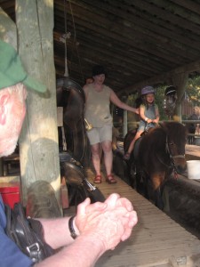 Ellen fik første ridetur, mens morfar ser på.