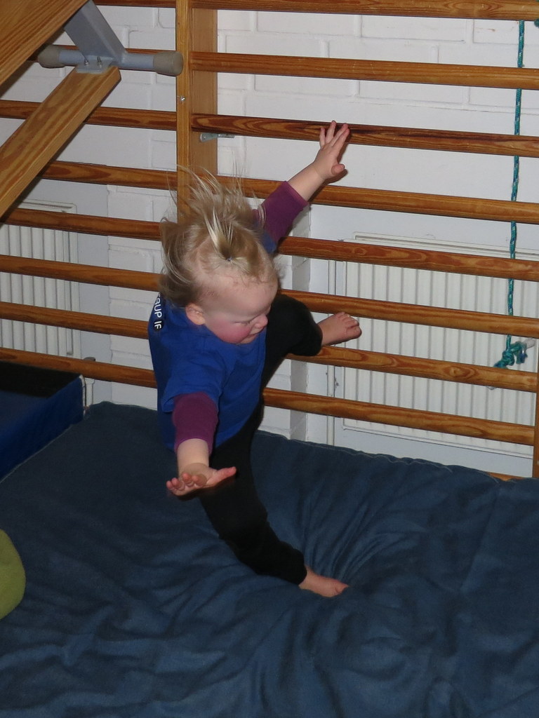 Hoppe, påskeæg » Og ned. (Hun kravler op i toppen og kaster sig selv ud – hun elsker det.)