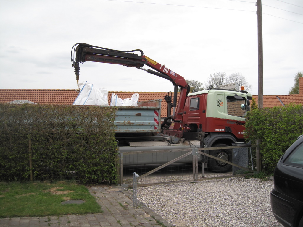En billedreportage » I går kom kranvognen med tre ton sand. Vi måtte lige rette postkassen op igen bagefter. :)