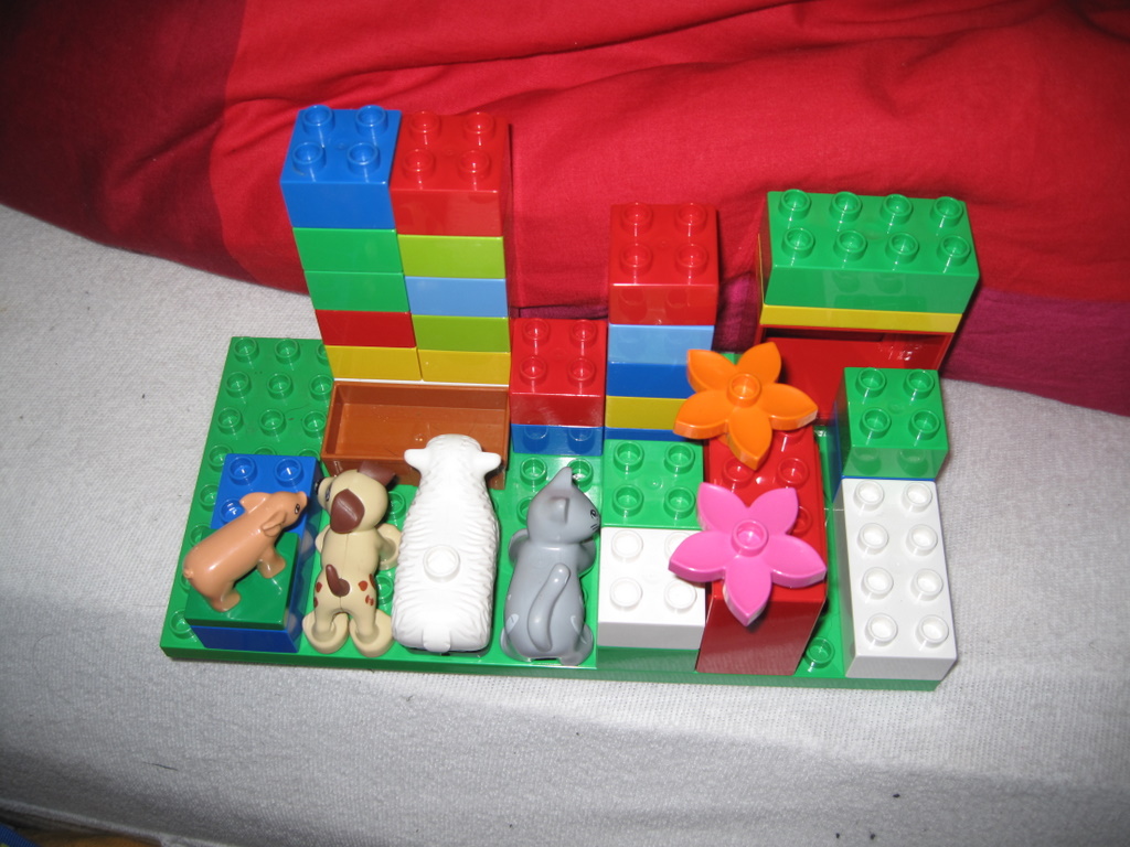 Huset er færdigt – læg mærke til at dyrene pænt står foran truget.