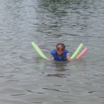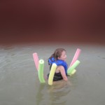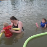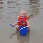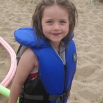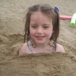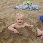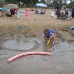 Vejret var fantastisk da vi kom, og Ellen, Trine og Karen løb straks i vandet. Kåre var langt mere kedelig og blev på land. Ellen havde mod på at prøve at øve at lære en smule at svømme – søslanger er en god ting, og Karen var især begejstret for at lege med en skovl og en spand i vandkanten. Det var nogle dejlige timer i total ro og fred, og både Karen og Ellen nåede at blive helt begravet i sand. Til sidst begyndte det at regne, og vi besluttede at det var tid til at komme hjem. Mens Ellen, Trine og Karen fik skyllet sandet af under bruseren (der var kun loftsbrusere og begge piger var totalt hysteriske, så det var noget af en opgave!), samlede Kåre tingene sammen, og fik hele regnskyllen, som var i stand til fuldstændig få ham gennemblødt på fem minutter. Og da regnvejret udviklede sig til et tordenvejr blev alle kaldt op og søen lukket af livredderne.
