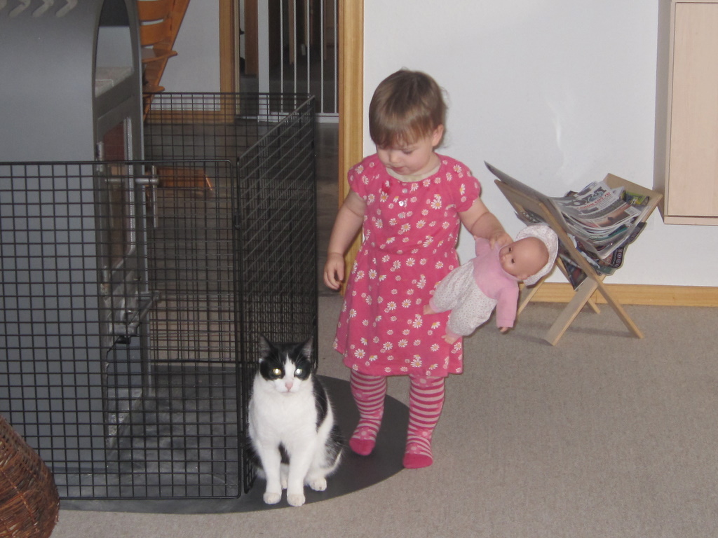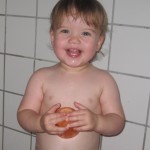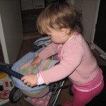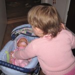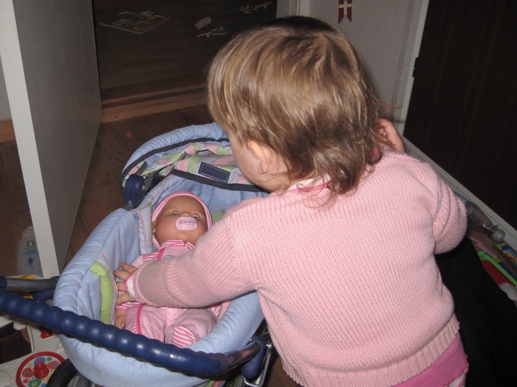 Aftenen er gået med dukkeputning og bad. Ellen puttede sin dukke, hev sutten ud af munden af hende, hev hende op, rakte begge dele til mig med ordet “sut” og når jeg så havde sat sutten i munden på dukken blev den puttet igen – og det kunne vi gøre lææænge. Sjovest var det da Ellen puttede dukken med ordene “det var godt!”. Og når dukken bliver puttet sætter Ellen fingeren op på næsen og siger “shhh”.
