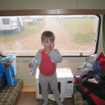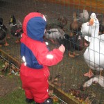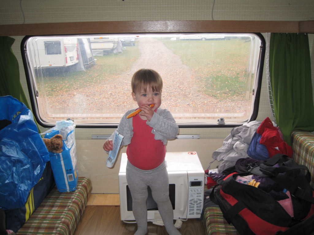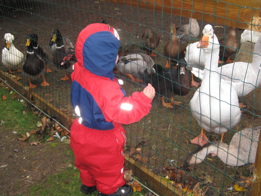 Desværre var vejret absolut ikke med os: Øsregn og stærk blæst. De fraråder at gå ind i skovene når der blæser meget, så da vi havde været rundt at hilse på alle campingpladsens dyr (Ellen synes at ænderne var de sjoveste) pakkede vi sammen og kørte hjem – måske også lidt på grund af det hul der viste sig at være i taget på campingvognen. 🙂