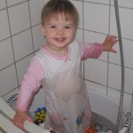 Så hun kom i bad og fik vasket hår. Bagefter fik hun en natble og en natkjole på og skulle bare lige have lov til at sjoske 5 minutter inden sengetid. Og så kom der ellers plaskelyde fra badeværelset. Gøjen var åbenbart IKKE færdig med at være i bad.