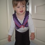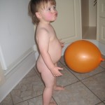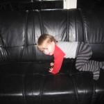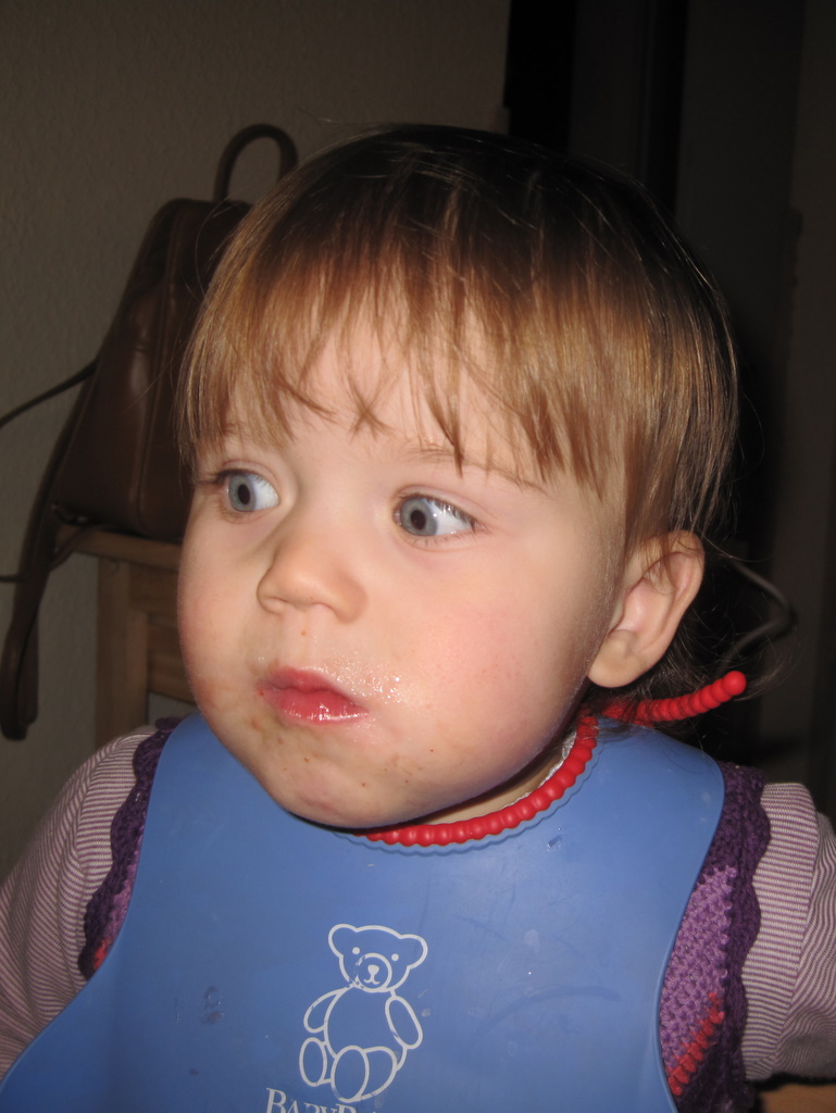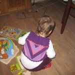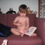 Efter aftensmaden var det tid til et lille uden-ble-forsøg. Først satte hun sig på potten, gik ud i gangen og tissede på gulvet og kom ind og satte sig på potten igen. 🙂 Lidt efter satte vi os sammen ude på toilettet – Ellen på potten og mig på gulvet (godt vi har gulvvarme!) – og læste en bog. Og så var der sørme gevinst! Men i løbet af det næste kvarter nåede hun alligevel at tisse på gulvet to gange. 🙂 Det skulle vist også være nemmere at mærke når man skal skide end når man skal tisse. Så i morgen prøver vi igen at sætte hende på potten og hygger lidt på badeværelset.