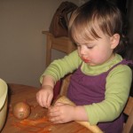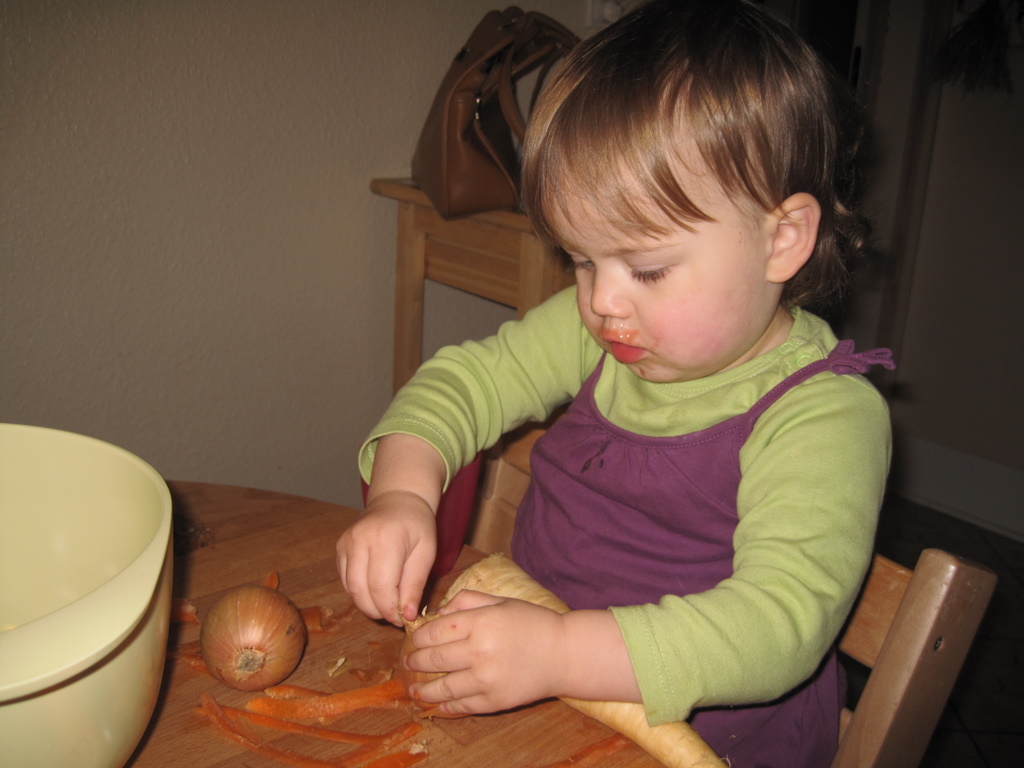 Da vi kom hjem fra vuggestuen skulle vi lave mad. Ellen hjalp med at skrælle gulerødder og pille løg. Men hun brugte nu også en del tid på at spise pastinakker og blomkål. 🙂