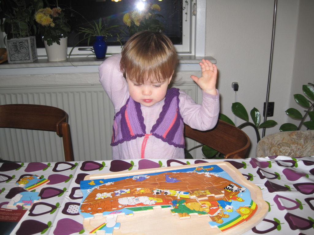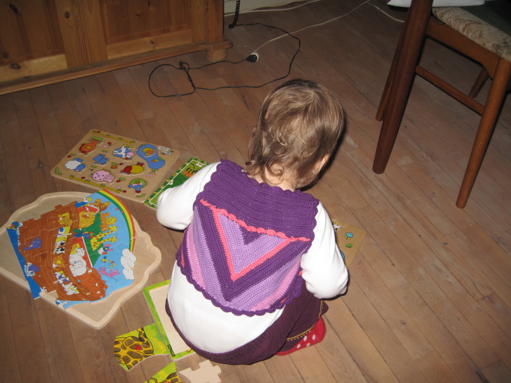 - Ellen lægger puslespil i sin nye vest.