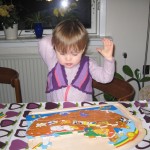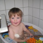 I dag har Ellen oversvømmet hele vuggestuen. Eller i hvert fald næsten. 🙂 Frank (en af pædagogerne) havde været ved at skifte et barn og skulle ud og havde de store med i skoven. Men han havde glemt at hejse bordet igen. Så pludselig lød der et skrig ude fra puslerummet. Alle kom løbende til, fordi de troede der var noget galt. Det var der ikke. Det var bare Ingrid (også en pædagog) der havde opdaget at Ellen sad oppe på bordet og havde åbnet på fuld blus for det varme vand – så der var vand OVERALT! Men jeg er sikker på at Ellen har hygget sig. 🙂