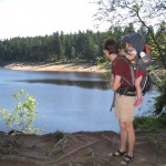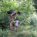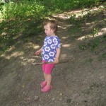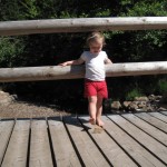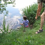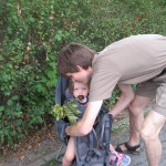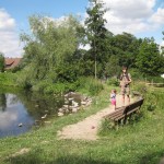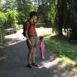 Efter frokost kørte vi igen ned til byen, bare til en anden bydel, hvor der skulle være en Walderlebnispfad/skovoplevelsessti. Heldigvis lå der en lille dam ved starten, for stien var der godt nok ikke noget sjovt i. Måske havde den været sjovere længere henne, men det sjoveste Ellen oplevede var at kaste pinde i vandet og plyndre et hindbærkrat.