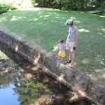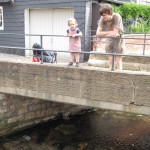 - Ellen og far kigger på fisk i vandløbet.