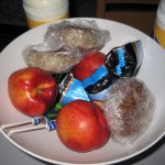 - Så er der dessert – Götterspeise med henkogt frugt og berlinere.