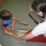 Ellen klarede fint at være med til jordemoder – hun legede med nogle klodser på gulvet.