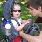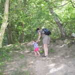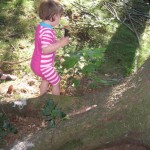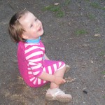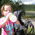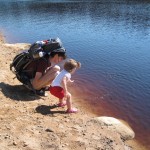 Ellen kom med i bærestolen og der var lige tre caches på vejen. Der blev også tid til sopning og til at kaste pinde og sten i vandet. Ved cache nummer to fandt Ellen pludselig noget hun ville bytte med – en blå hårelastik. Cachen bestod blot af en zip-lock-pose, men den var fint tør.