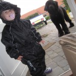 I går aftes fandt vi et par flyverdragter i en kasse fra Katja og Henrik, så vi skulle lige se om de var til i år eller næste år. Så Ellen var lige en tur i haven iført ble, flyverdragt og gummistøvler.