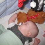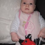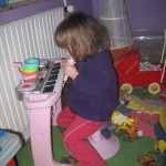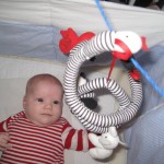 Og Karen er begyndt at “lege” med ting – hun synes det er sjovt at skubbe til noget der siger lyde. Så det var godt jeg fik købt noget legetøj til hende.