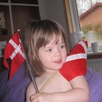 I dag vågnede vi ved at hun sad inde i sengen og sang “Se min kjole” og da hun så kom ind til os sang vi for hende med flag og det hele – det synes hun var noget underligt noget. Men hun var helt med på det der med gaver. 🙂 Af os har hun fået en tallerkenrække til sine bøger og en kurv med grøntsager i stof.