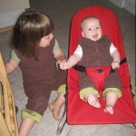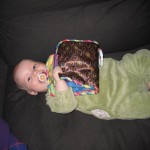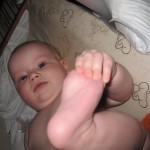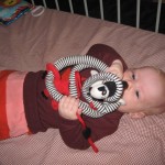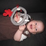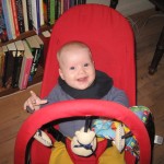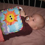 Karen er rigtig begyndt at lege med legetøj nu. Hun har specielt en bog og en uro som hun er meget glad for. Hun har også fundet ud af at hvis man løfter overkroppen og slår den hårdt ned i skråstolen, så vipper den.