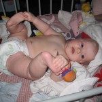 Søndag aften blev Karen for første gang puttet i vuggen. Indtil da sov hun mellem os i dobbeltsengen. Men det gik ligesom med Ellen – hun lagde sig til at sove. Der har ikke været nogle problemer med det – det er nu nogle nemme unger vi har os.