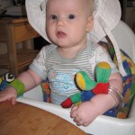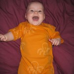 Karen har fået vasket hår i dag – for første gang. Hun blev placeret på en vaskeklud i en høj stol fra IKEA i bruseren og så brugte jeg en af Ellens vandkander til at hælde vand over hende. Hun synes det var vældig sjovt.